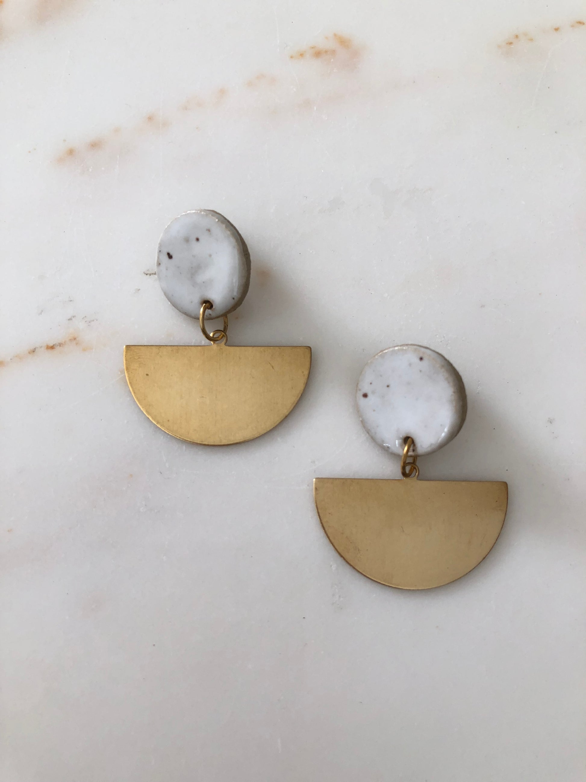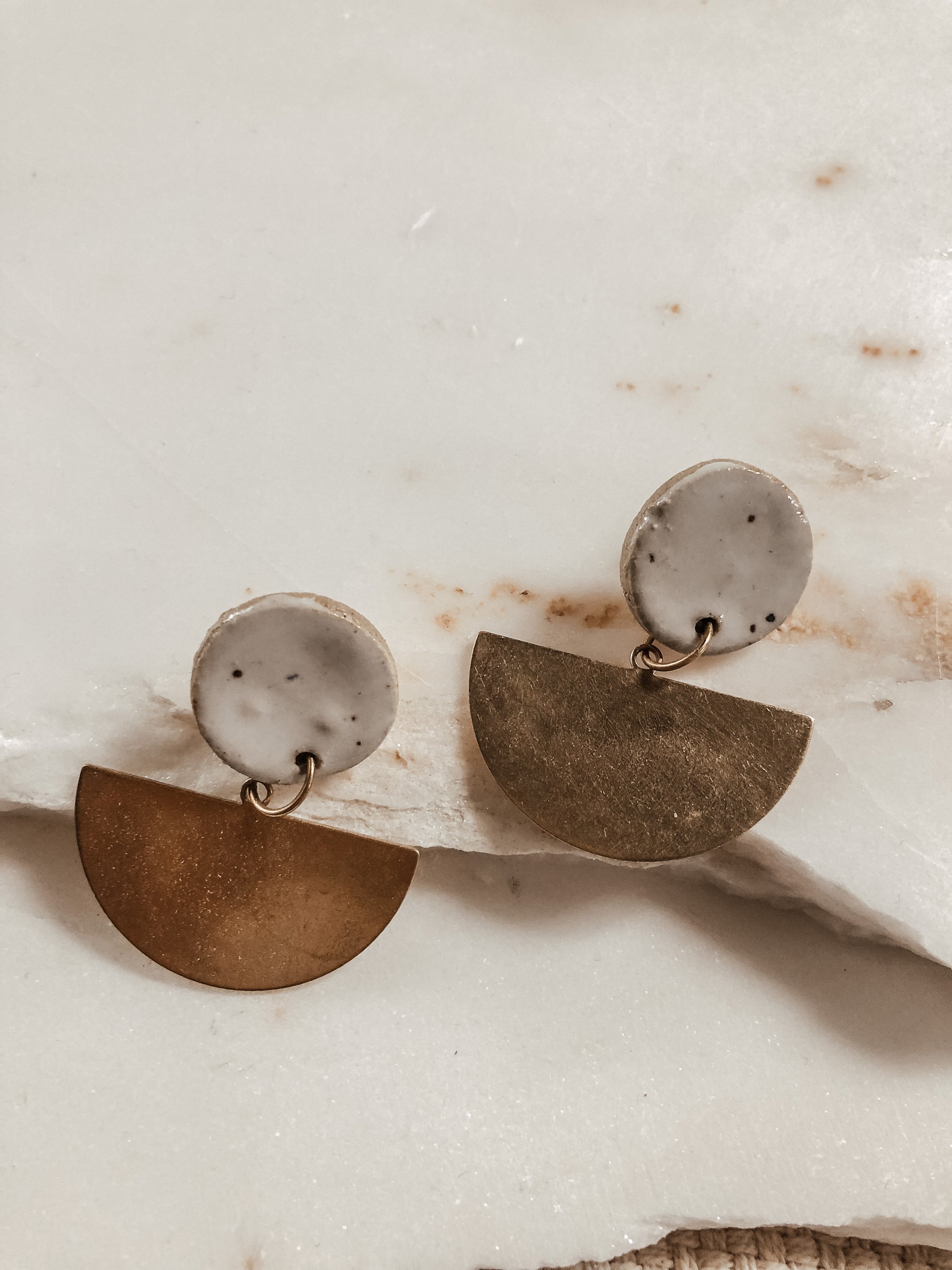 Drawing inspiration from the masterful bamboo made boats of the Philippines, these earrings evoke the evocative image of a seafarer and its tranquil waters. The clay studs perched atop the brass half-moons offer a masterful blend of the discreet and the gleaming.