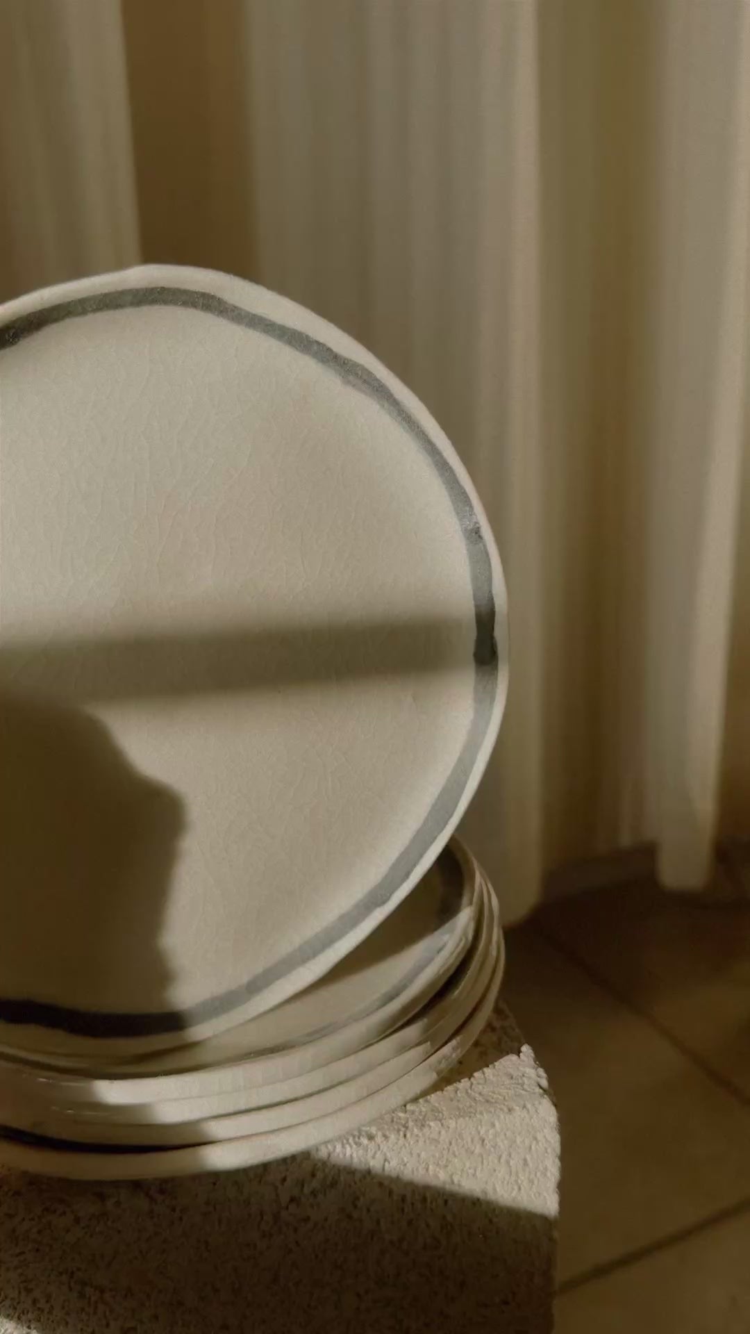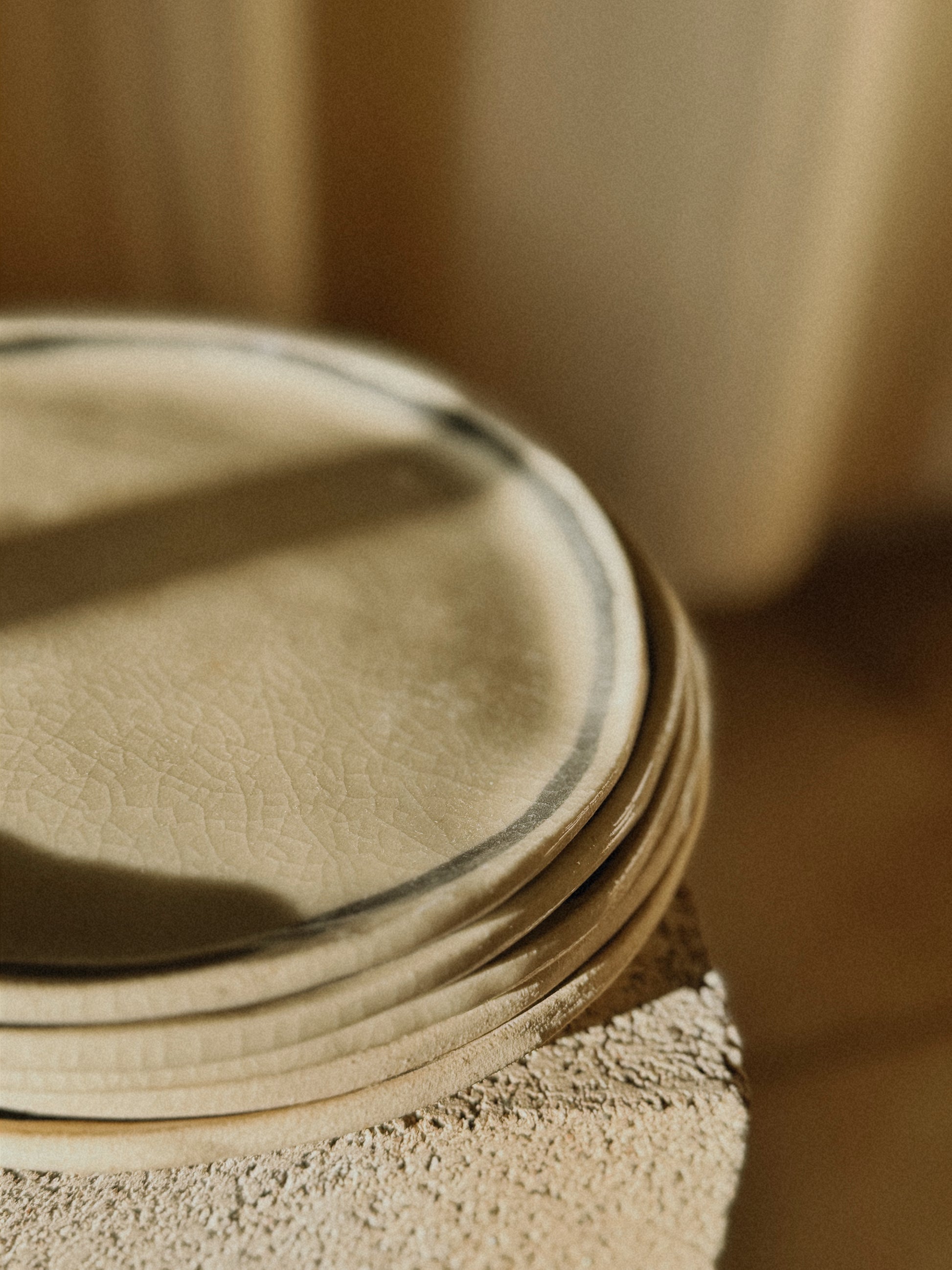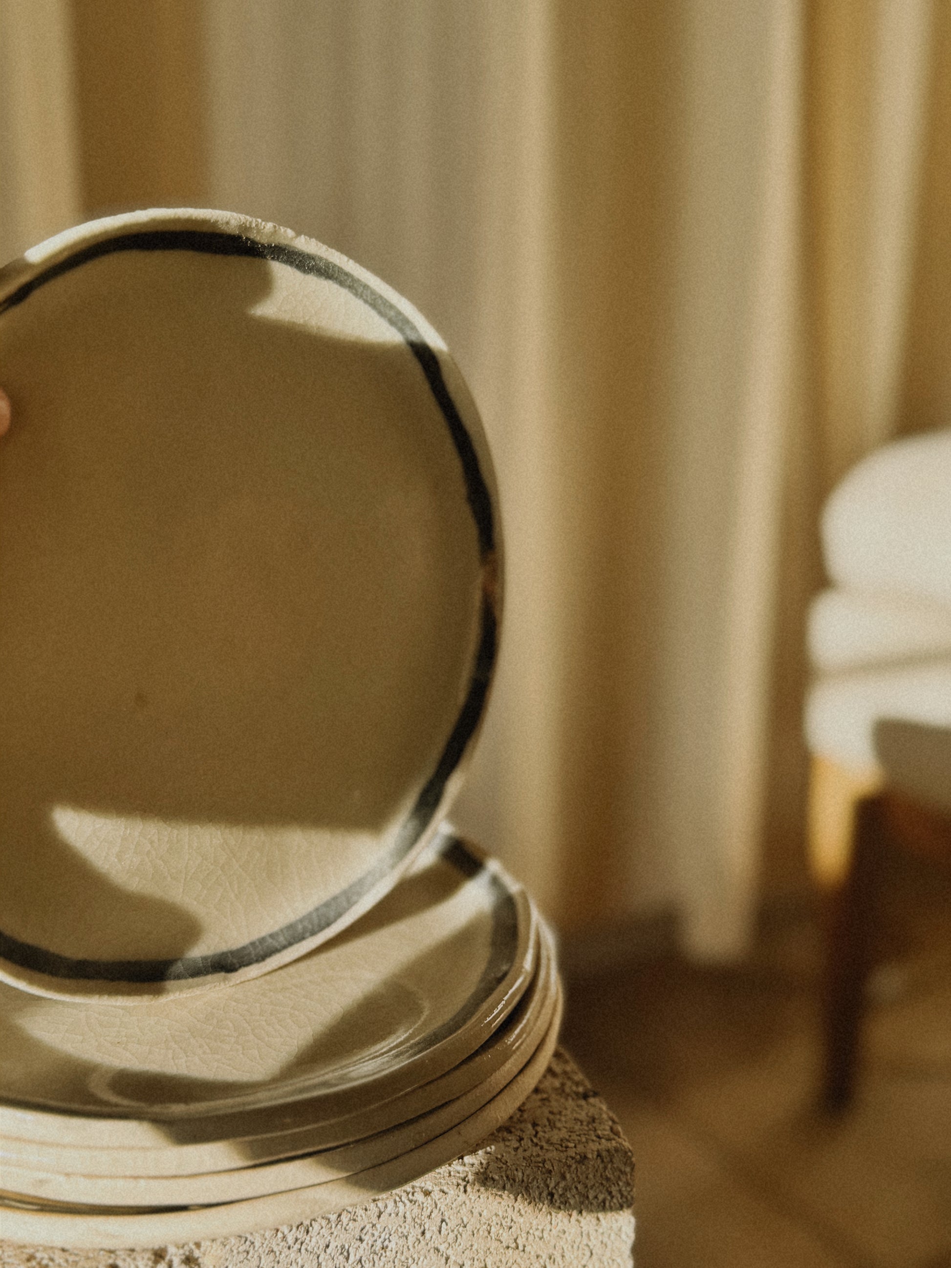 Crafted with a white clay body, this 7” plate is glazed to a crackled clarity, and graced with a black, hand-painted rim, each order containing one.