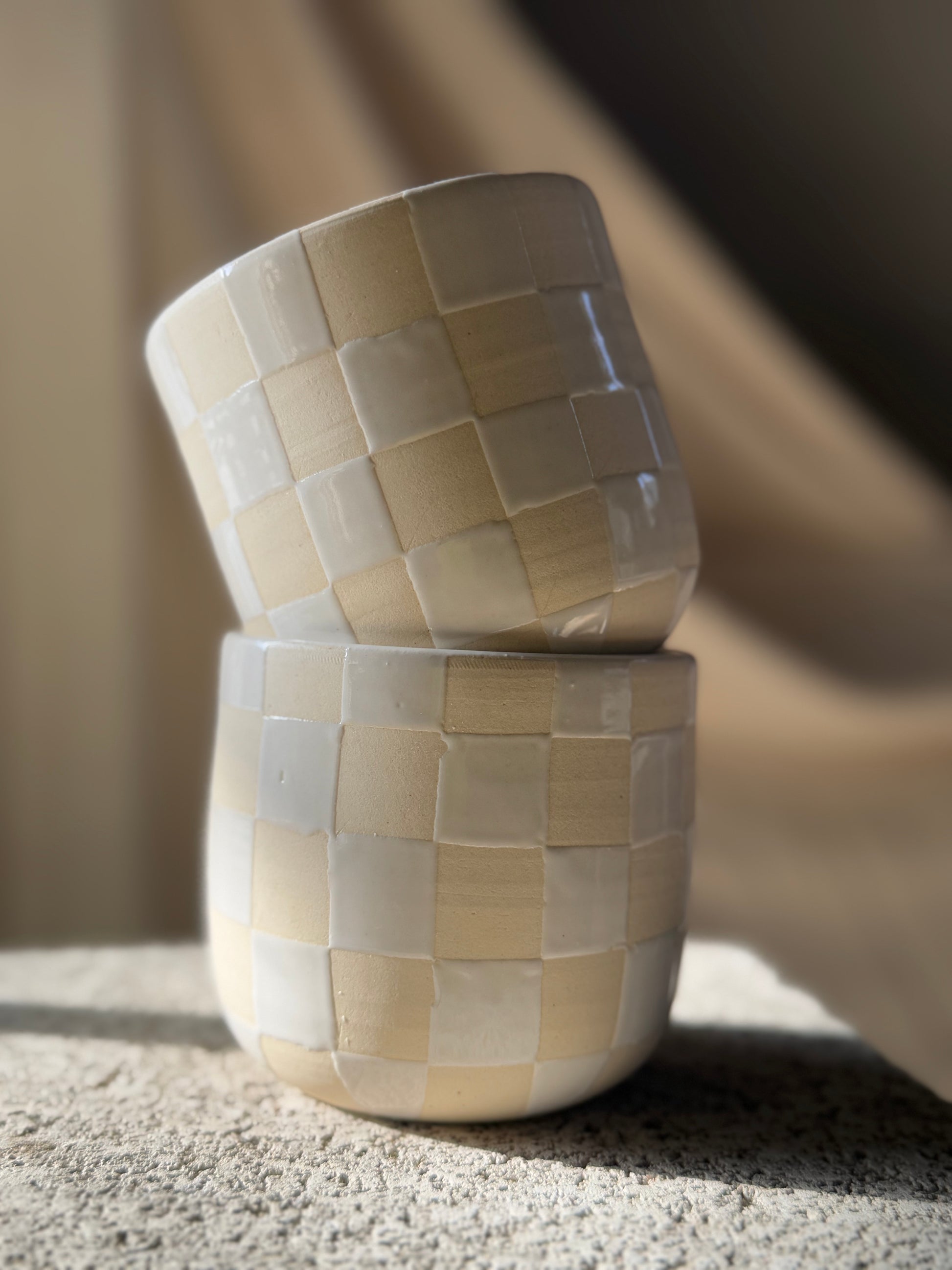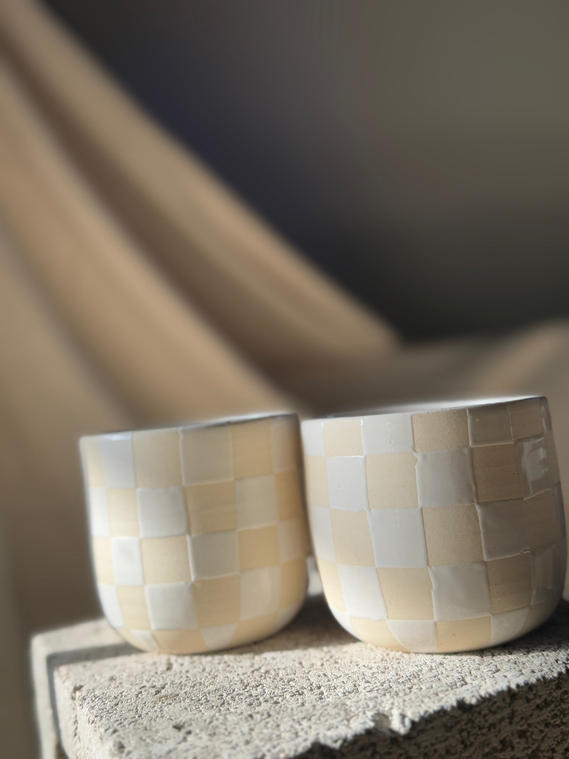 Elevate your caffeine intake with our exquisite, artisanal Checkered Mug. Each mug is skillfully crafted on a pottery wheel, creating a unique and elegant piece. The classic checkered pattern brings a sense of opulence to your daily routine. Handle-free design for a perfect fit in your hand.