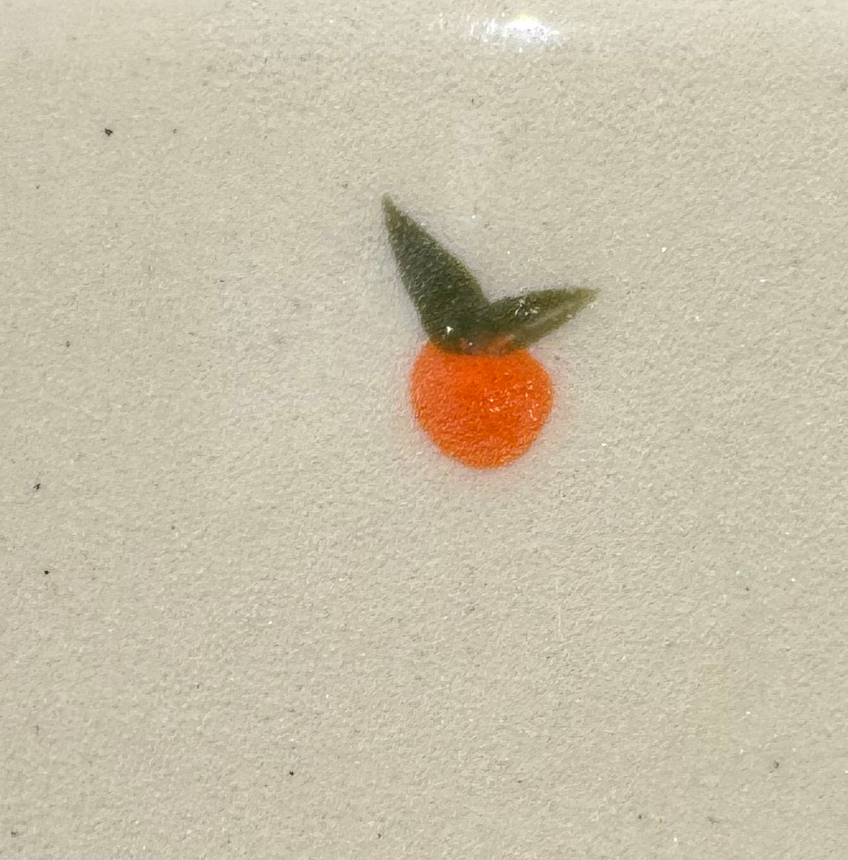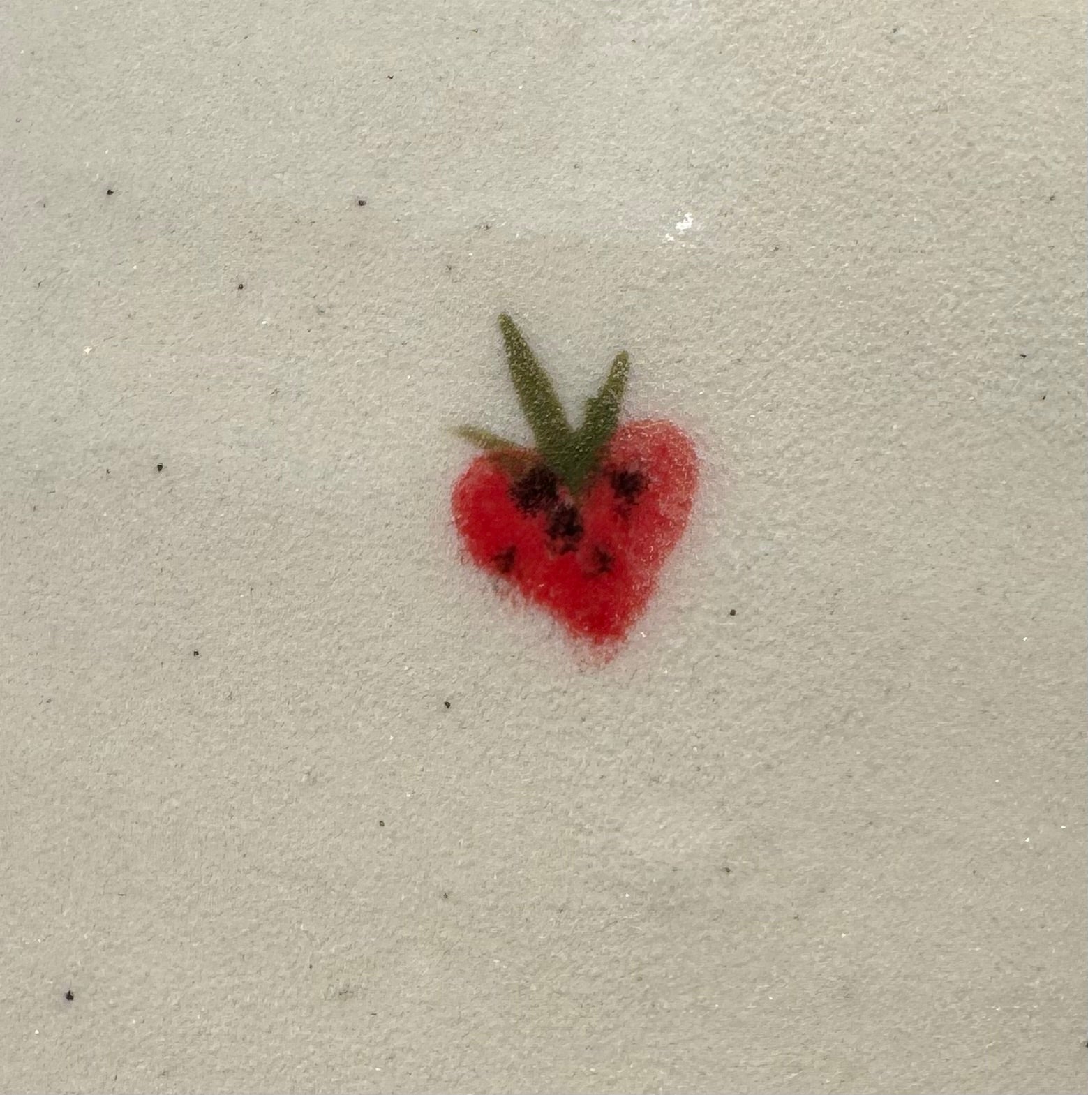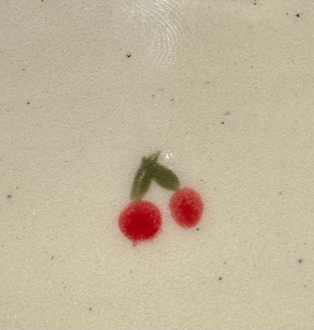 A cup, sans handle, thrown by hand for that perfect grip. Pretty little fruits playfully adorn the cup.