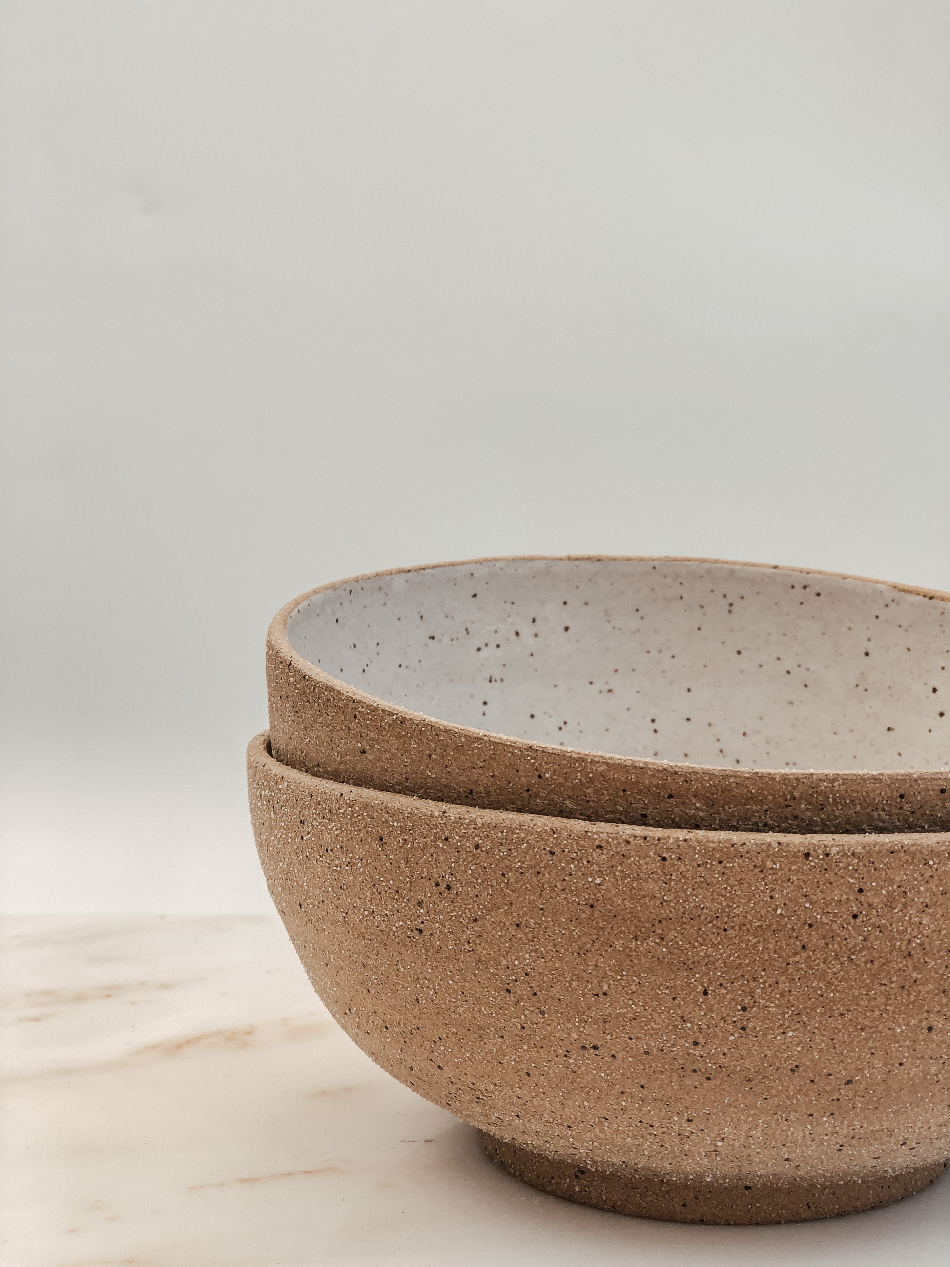 Speckled raw clay on the outside with a white glaze on the inside.