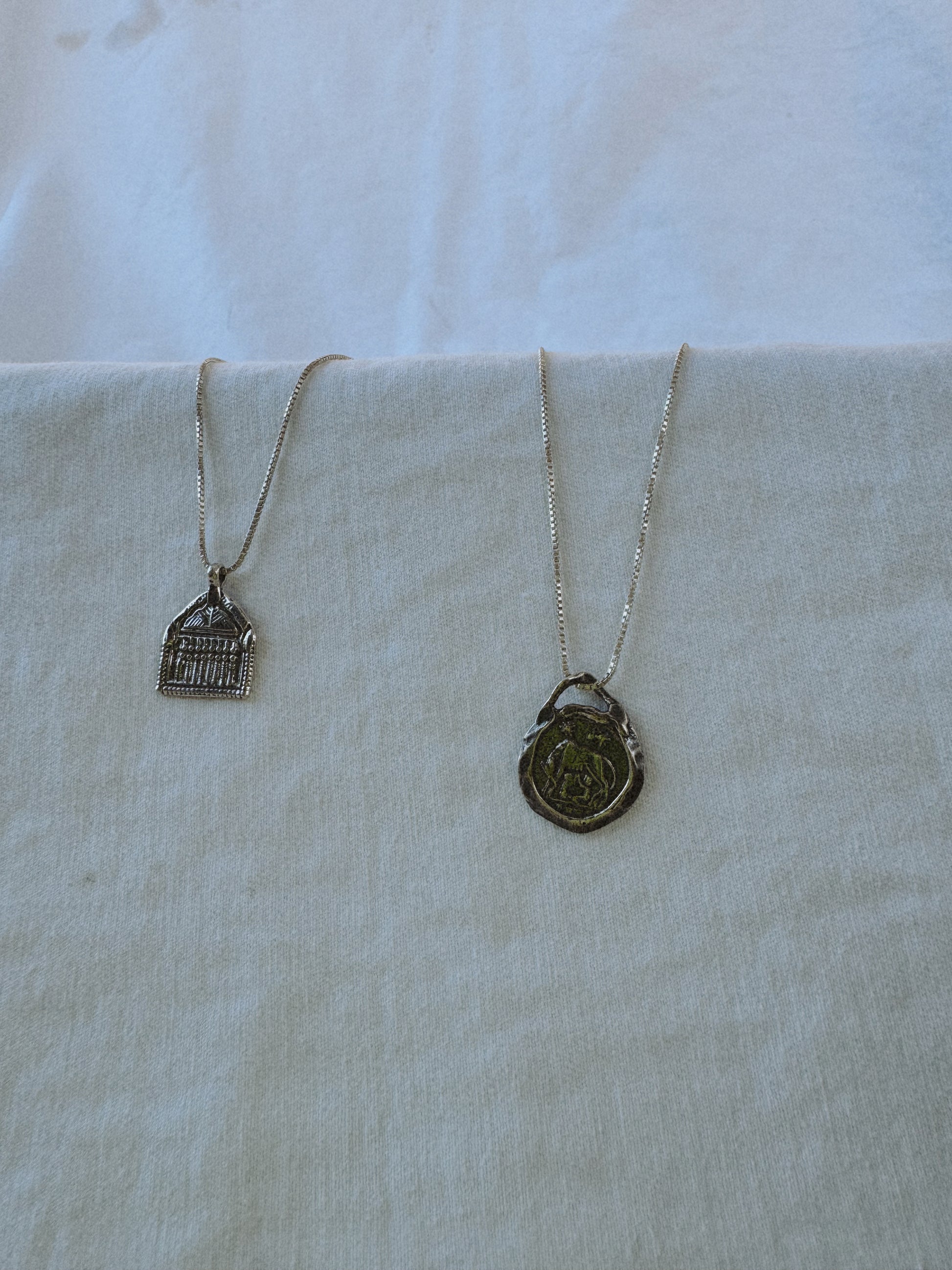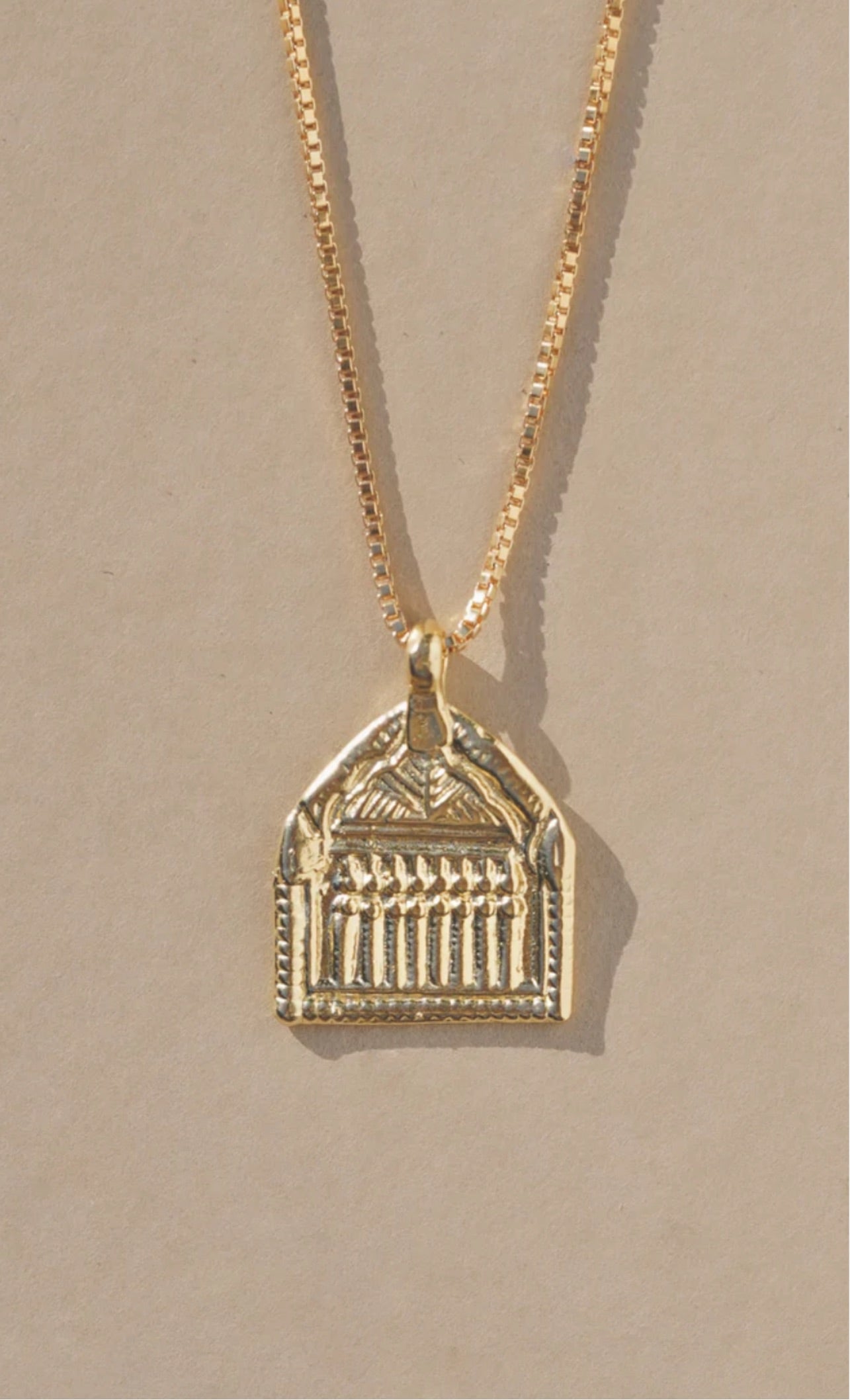 Delicate light weight carved charm necklace intended to represent a door, window, passageway or opportunity.
