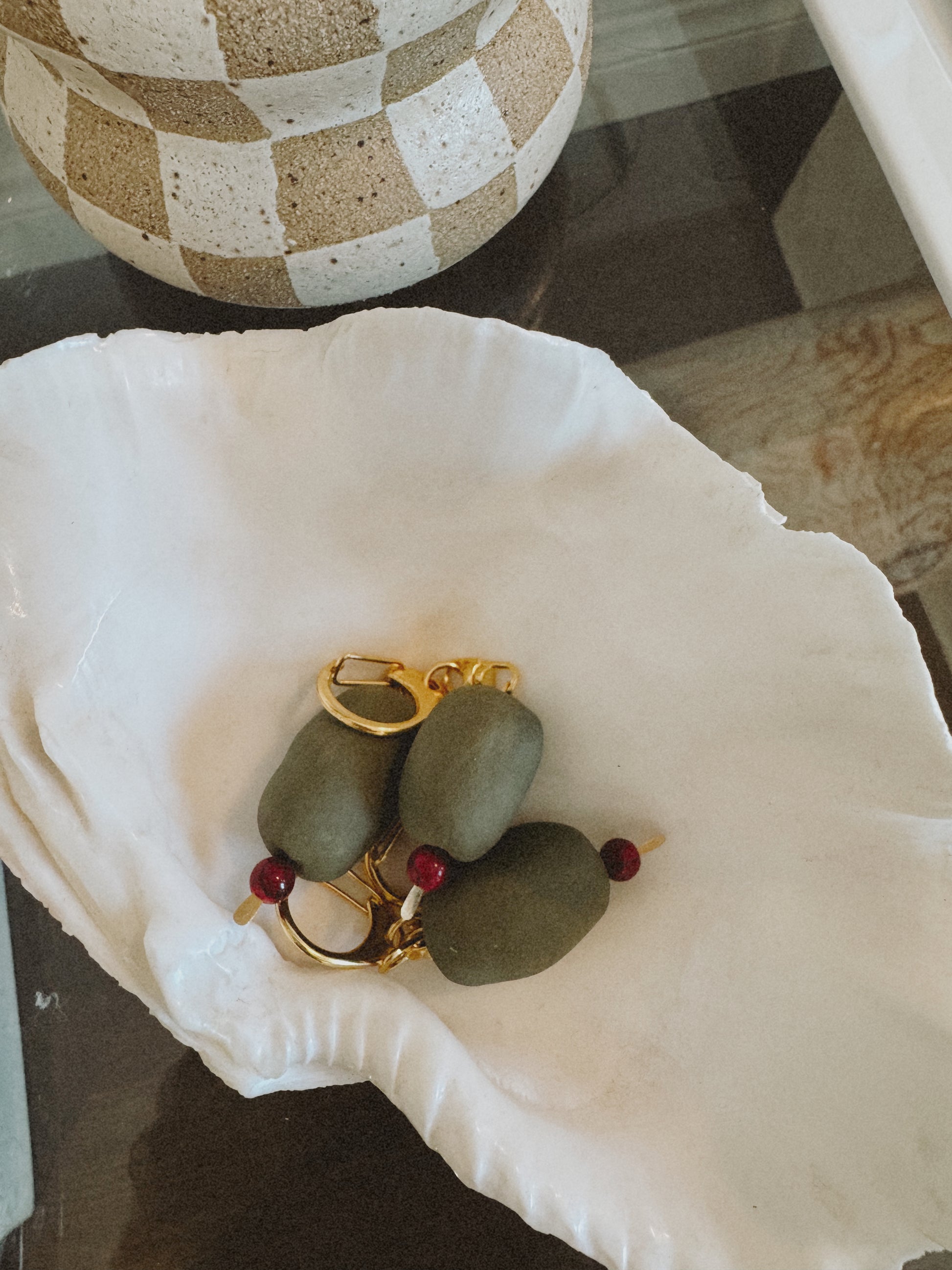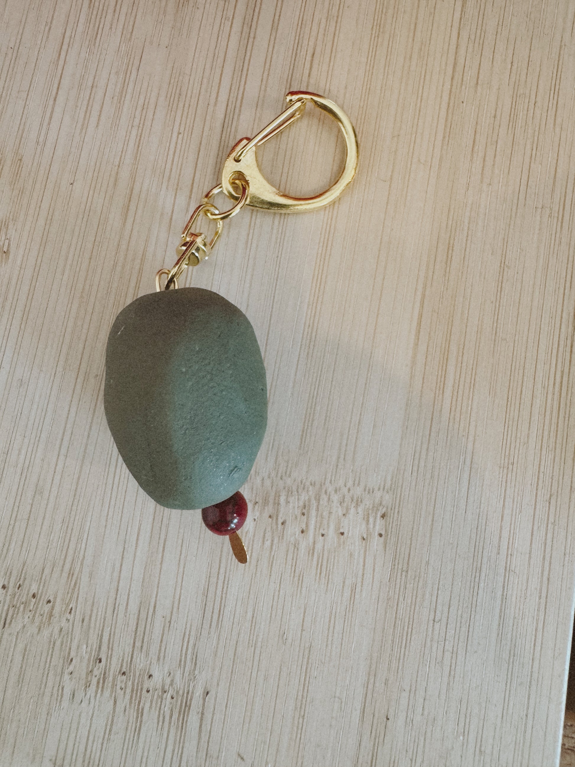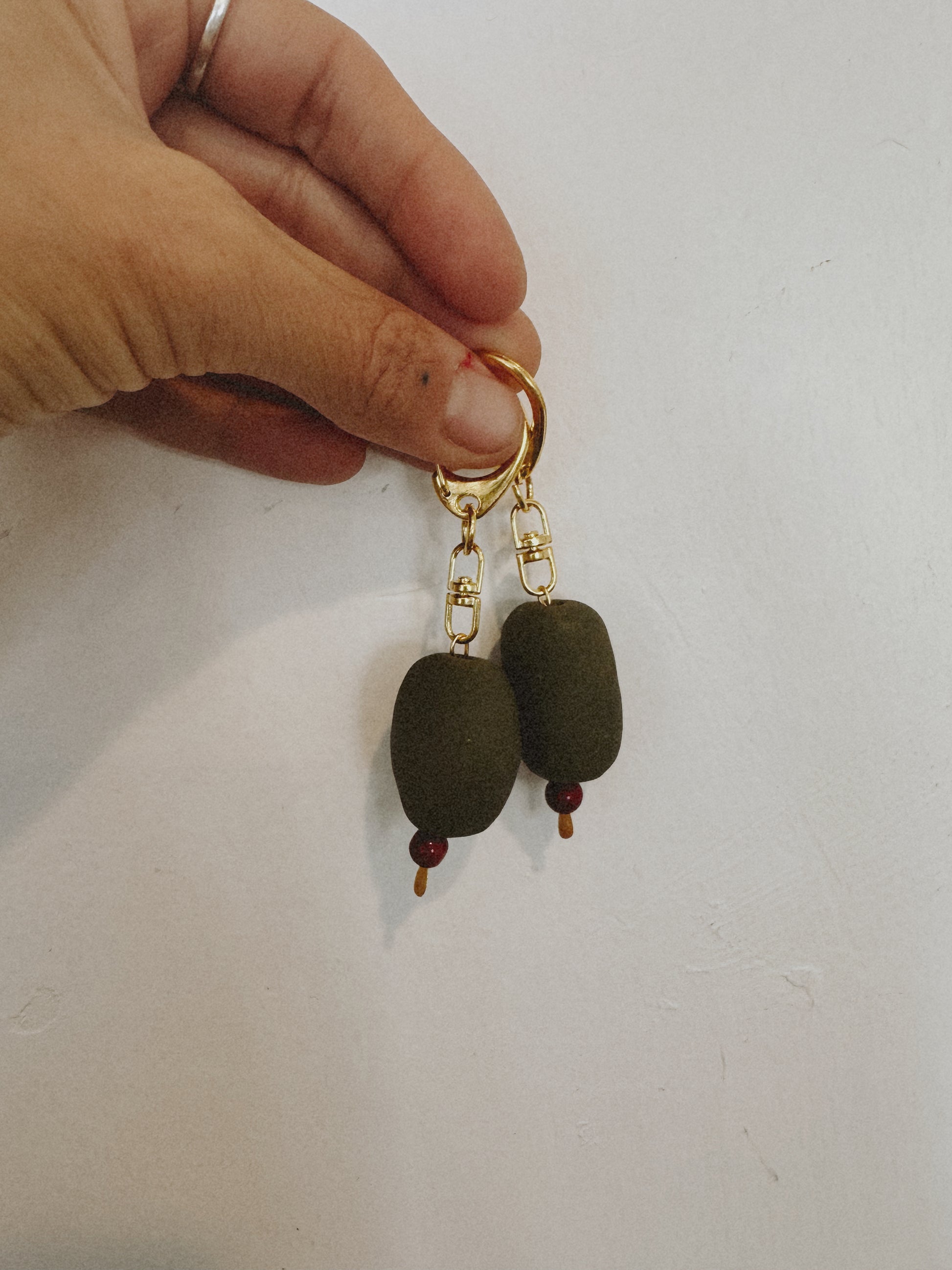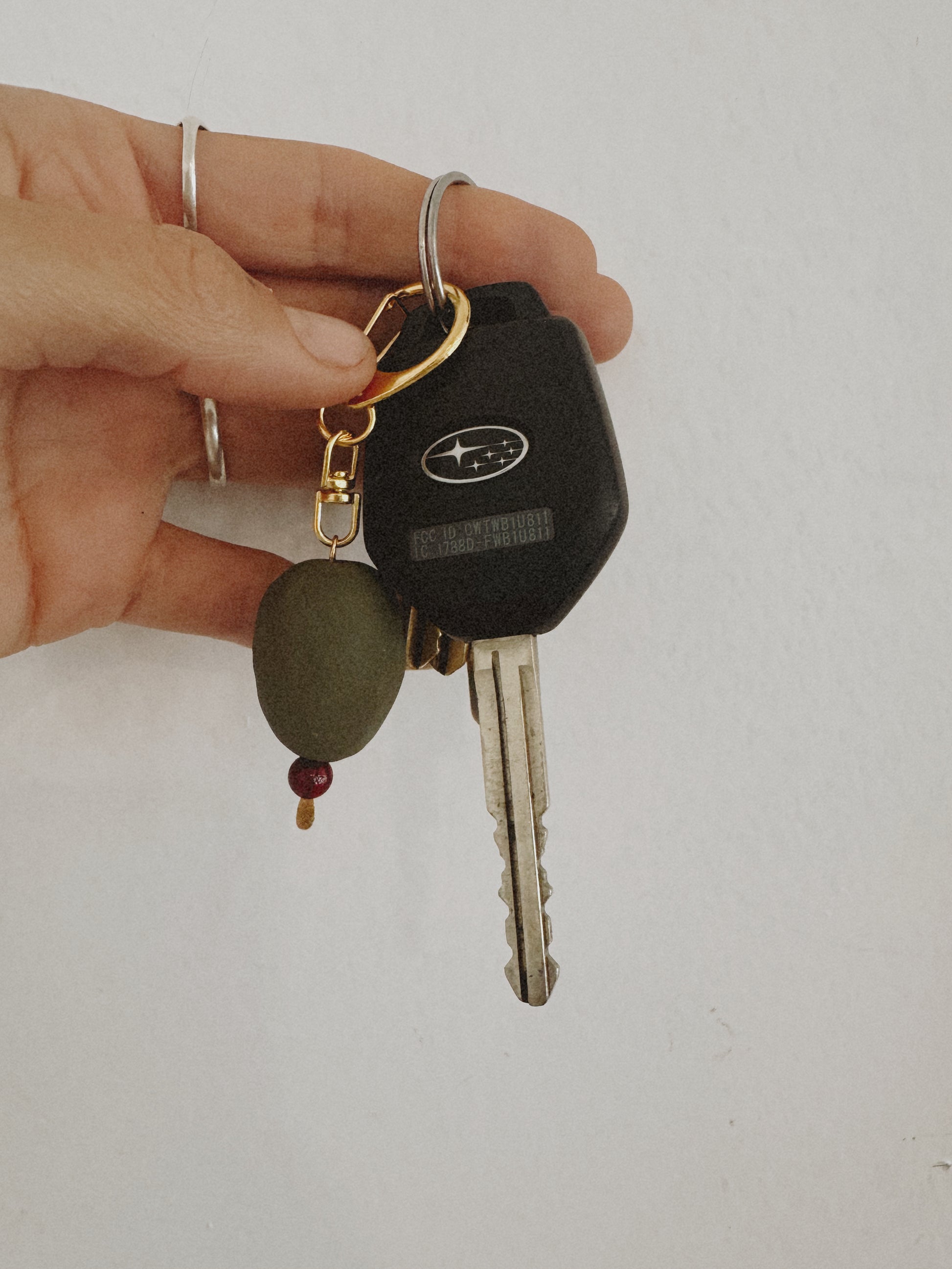 Add a playful charm to your keys or bag with this adorable Olive Key Chain. Handmade from ceramics and hand-painted the olive features a red dyed quartz and gold filled accent details that catch the eye. The gold-colored locking clasp keeps your keys secure. Perfect for those who love unique, artisanal accessories with a fun twist! 🍸